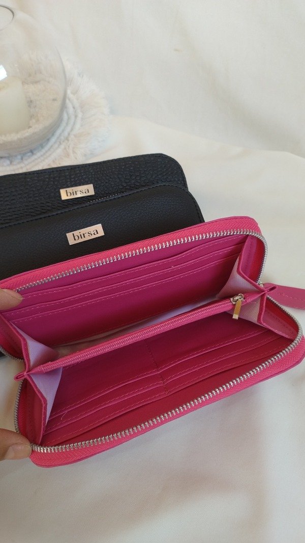 Seis compartimientos para tarjetas, división para billetera y cierre interno